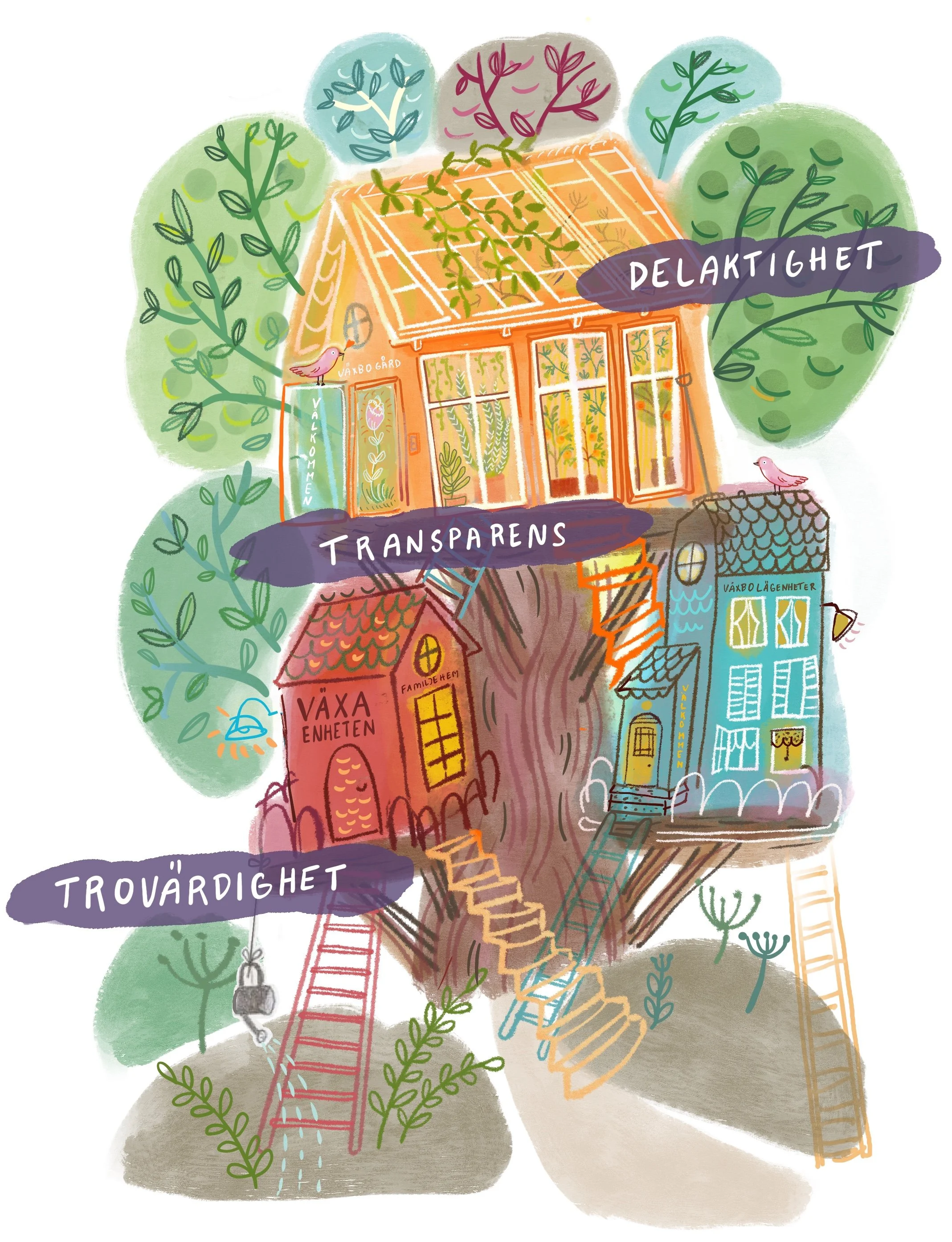 Grunden i VäxaEnhetens hus vilar på tre bärande värderingar: trovärdighet, transparens och delaktighet.